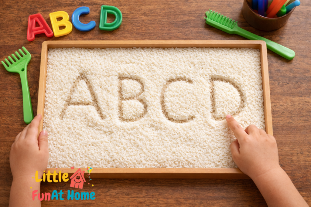 Start by adding a thin layer of rice, flour, or colorful sand to the tray, just enough to cover the base. Then encourage your child to use their finger or a paintbrush to trace letters in the tray.