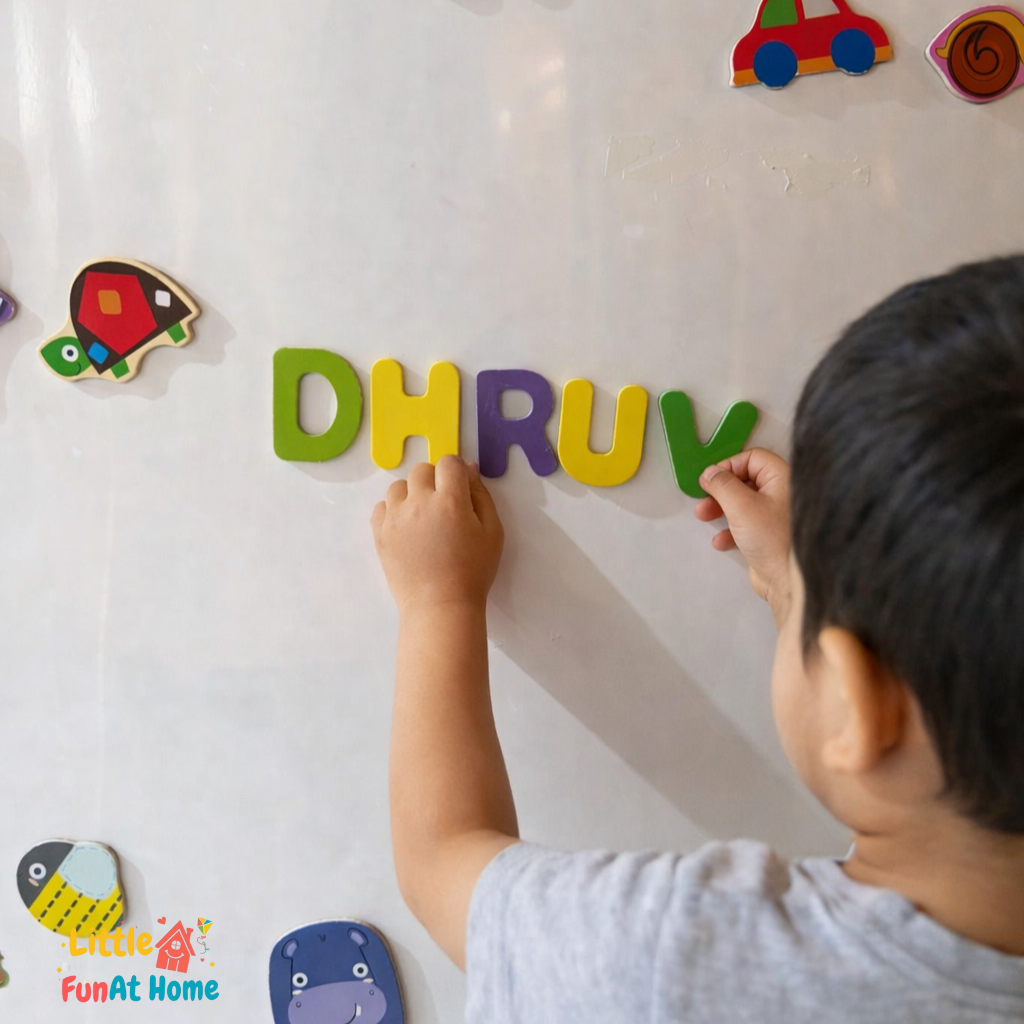 write your child’s name on paper and ask them to place the matching magnetic letters on top. It’s simple, fun, and really helps with letter recognition.